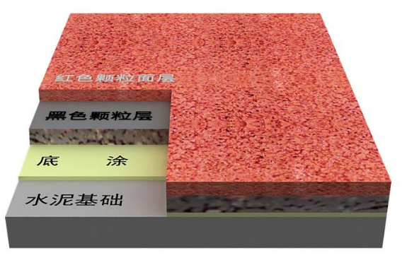 复合型塑胶跑道该材质所用胶面胶分两层,底层同透气型跑道一样,将弹性胶粒与聚氨酯粘合剂,采用摊铺设备制成缓冲弹性层,厚度约10mm 面层胶铺设2~ 3mm厚聚氨酯胶浆,撒上EPDM胶粒作为磨损面层。