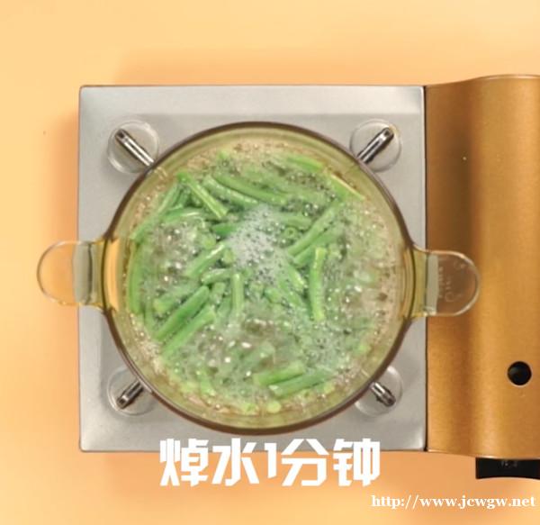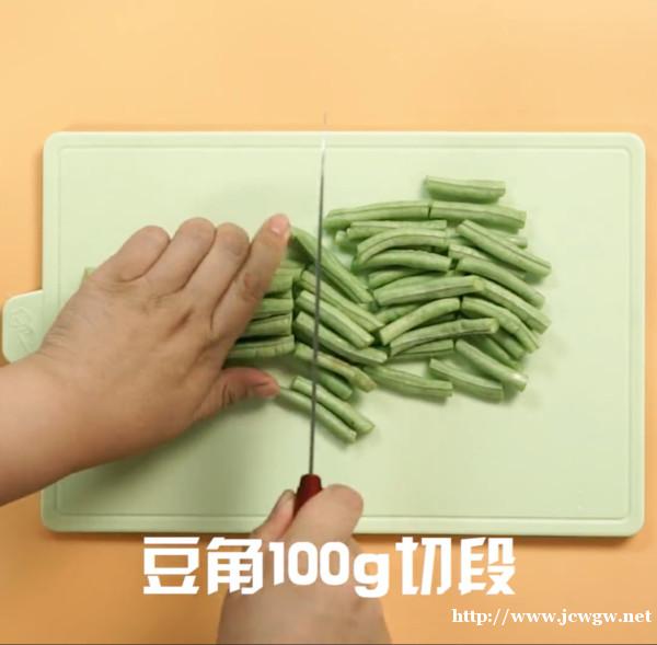 1.豆角洗净后,折成小段,倒入盐多揉几下,揉至变色