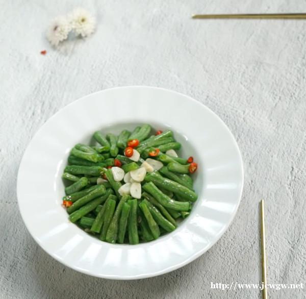 3.翻炒豆角至熟后,倒入蒜瓣即可起锅
