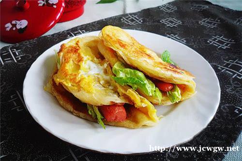 鸡蛋灌饼是一道河南的小吃,听名字就知道是用面粉和鸡蛋做的,是把鸡蛋灌注半熟的饼里然后煎至熟透。然后抹上酱料加上自己喜欢吃的青菜、火腿、培根等食物,非常的美味!